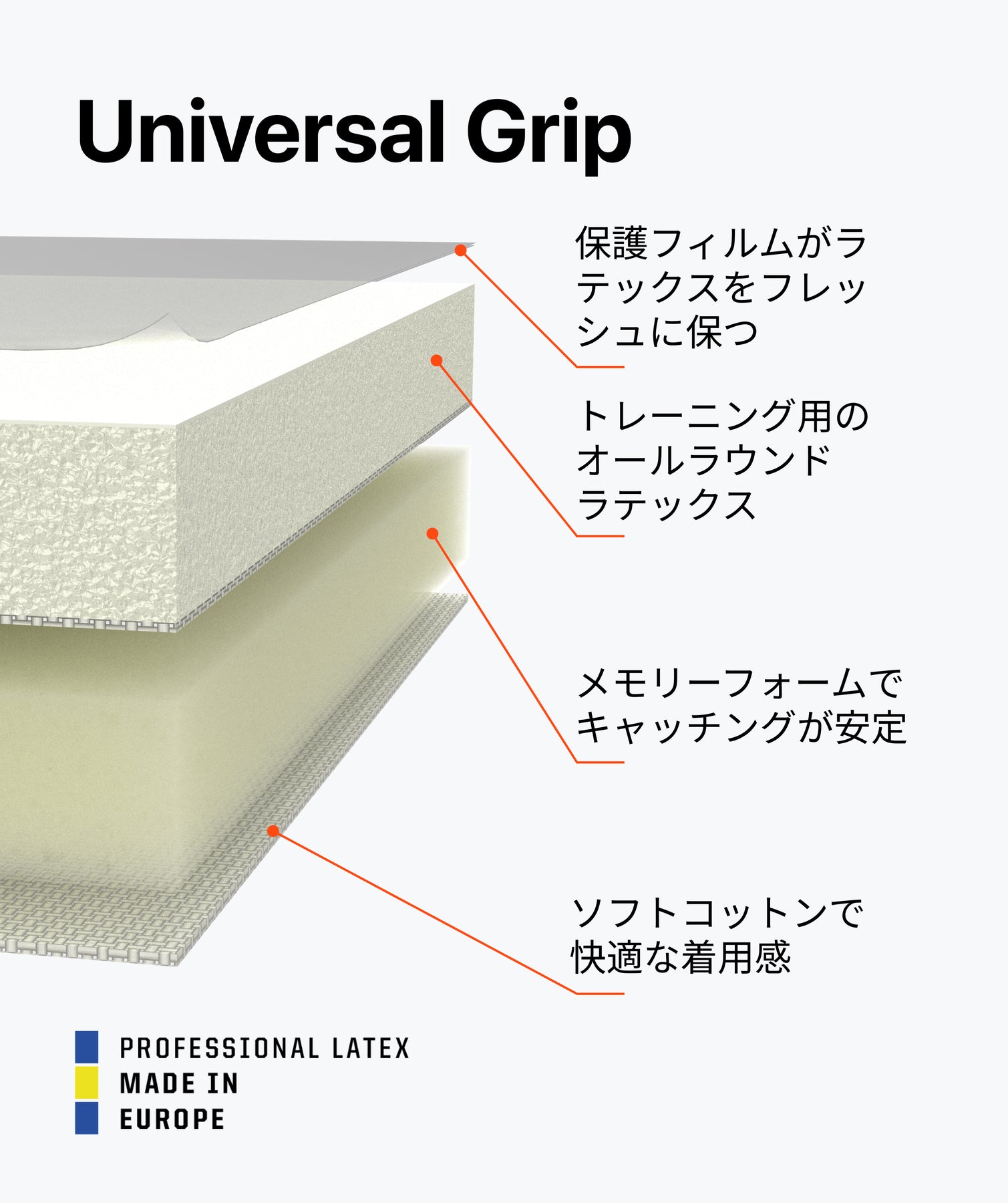 グリップ力のある3mmユニバーサルグリップ。全面にラテックスを使用し、非常に軽量。通気性の良いメッシュ素材。 印象的なフィット感。耐摩耗性に優れ、より長持ち。簡単な着脱。コントロール性の高いバックハンド。